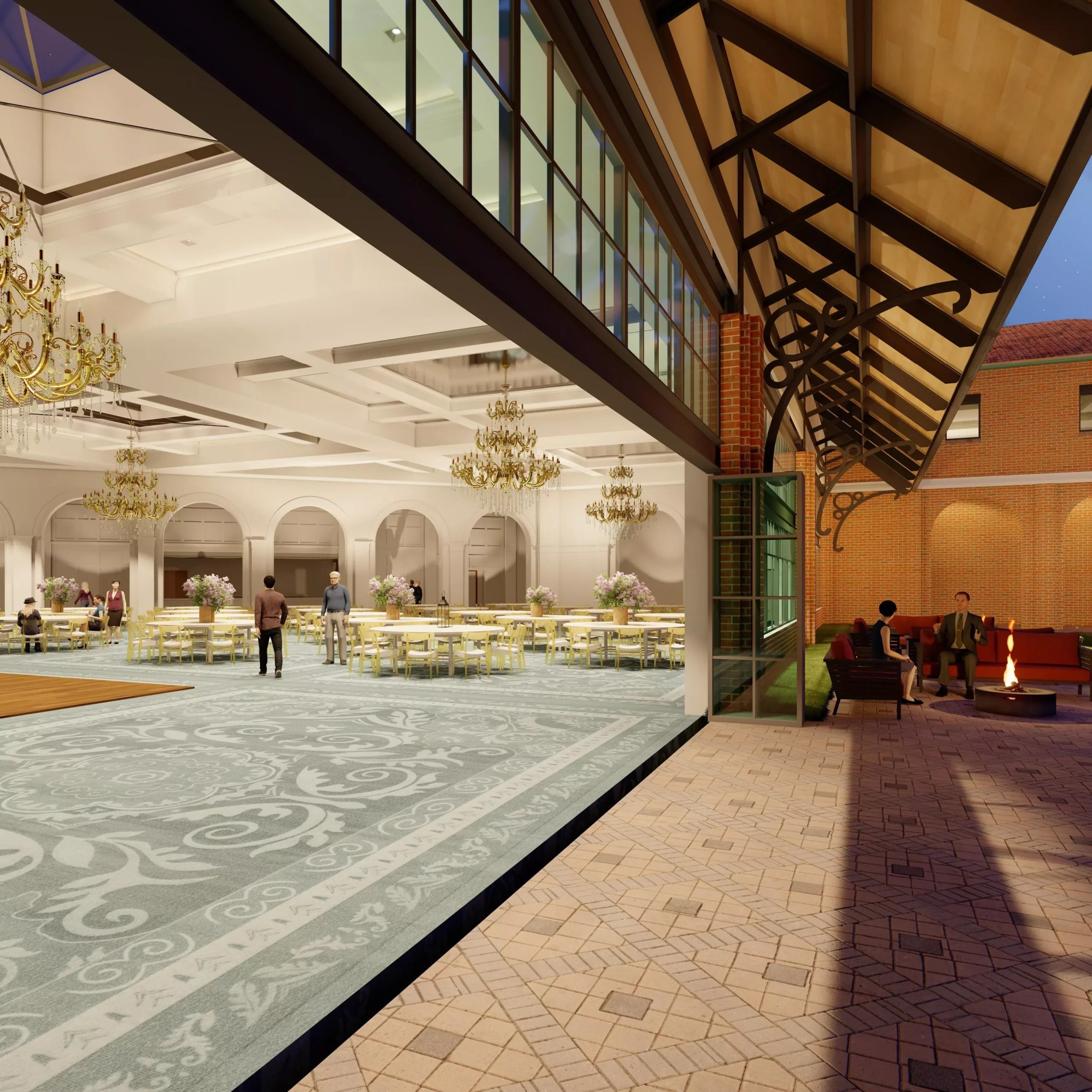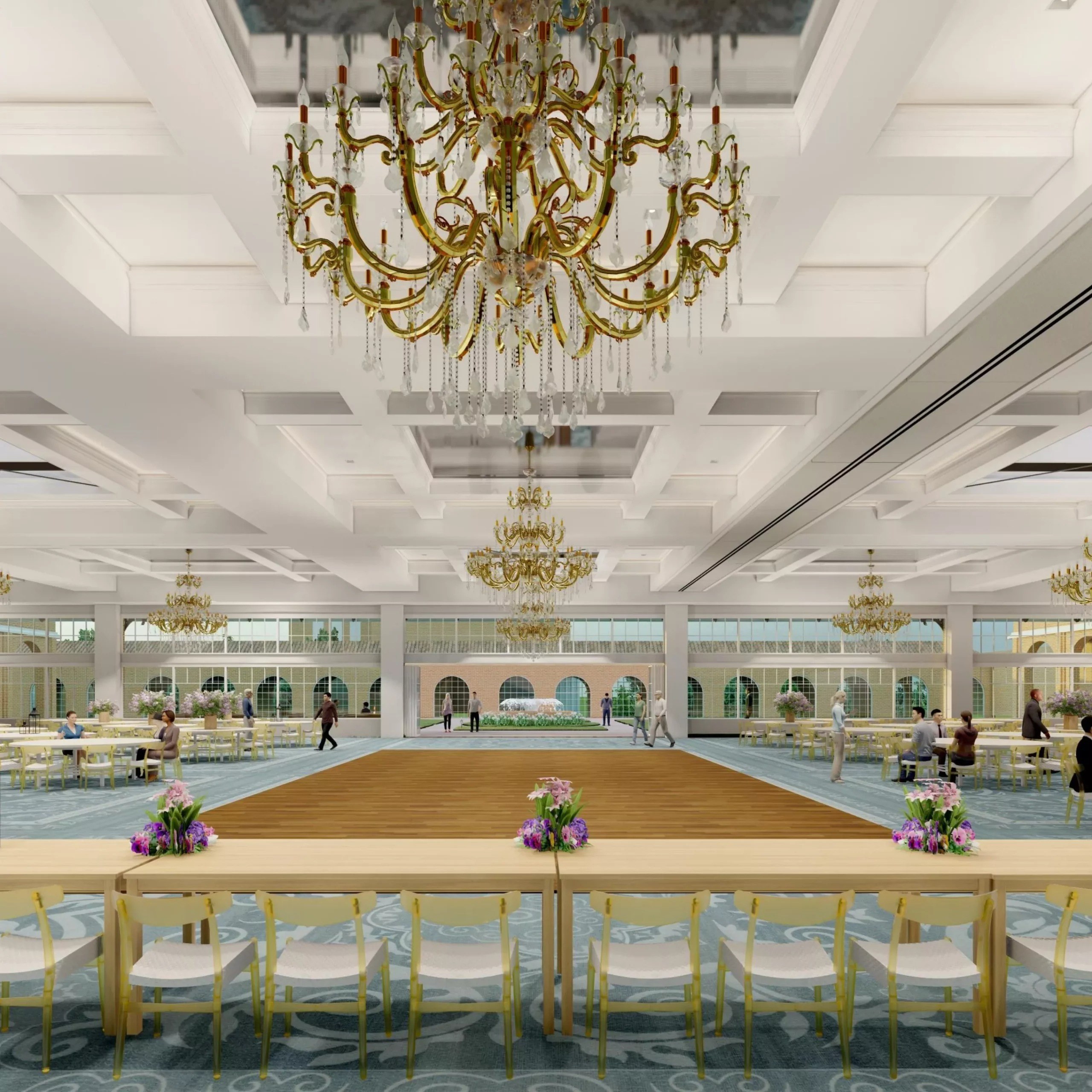 The Monarch Ballroom is 15,000 square feet, accommodates up to 2,000 people and features a 200 foot glass wall that overlooks a spacious courtyard with casual seating, three skylights, nine large crystal chandeliers and an impressive 100 foot sky wall that separates the room into two sections. It also has an additional 13,000 square feet of event space spanning over three floors. The Monarch Ballroom is the perfect place to host extravagant weddings, galas, concerts and large corporate events.
