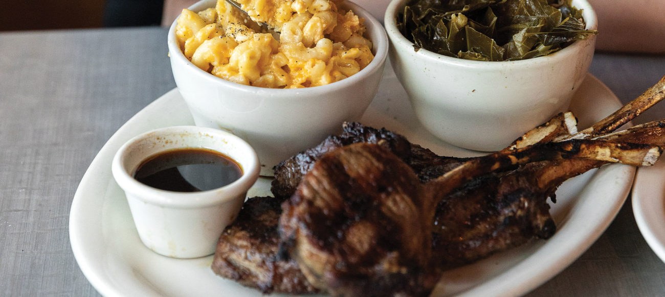Lamb chops with a side of mac and cheese and collard greens. Photo by Michelle Gerard